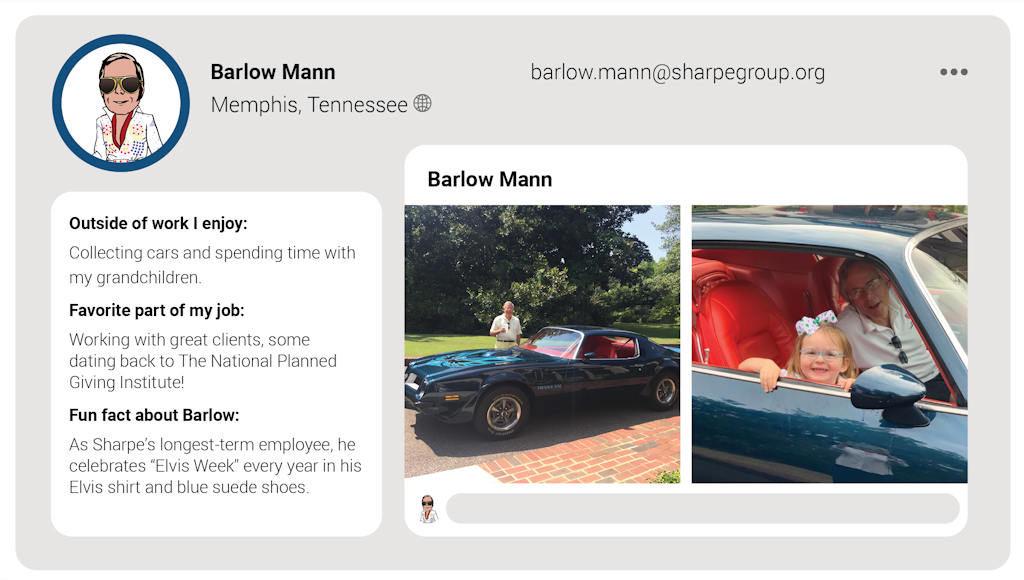 Barlow Mann has more than four decades of experience in charitable gift planning and serves as Sharpe Group general counsel. Prior to joining Sharpe Group, he was director of development at the University of Tennessee Health Science Center, where he was responsible for current, deferred and capital giving for the colleges of medicine, pharmacy, dentistry, nursing and allied health. He also has served as director of planned giving for the University of Memphis and coordinated resource development projects with the University of Tennessee Bowld Hospital.
